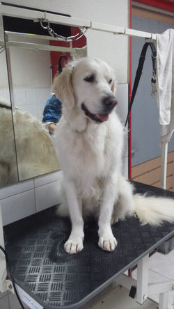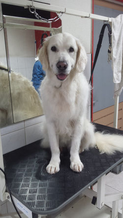 ![]() | ![]() Djazzy de Golden Retriever voor het trimmen |